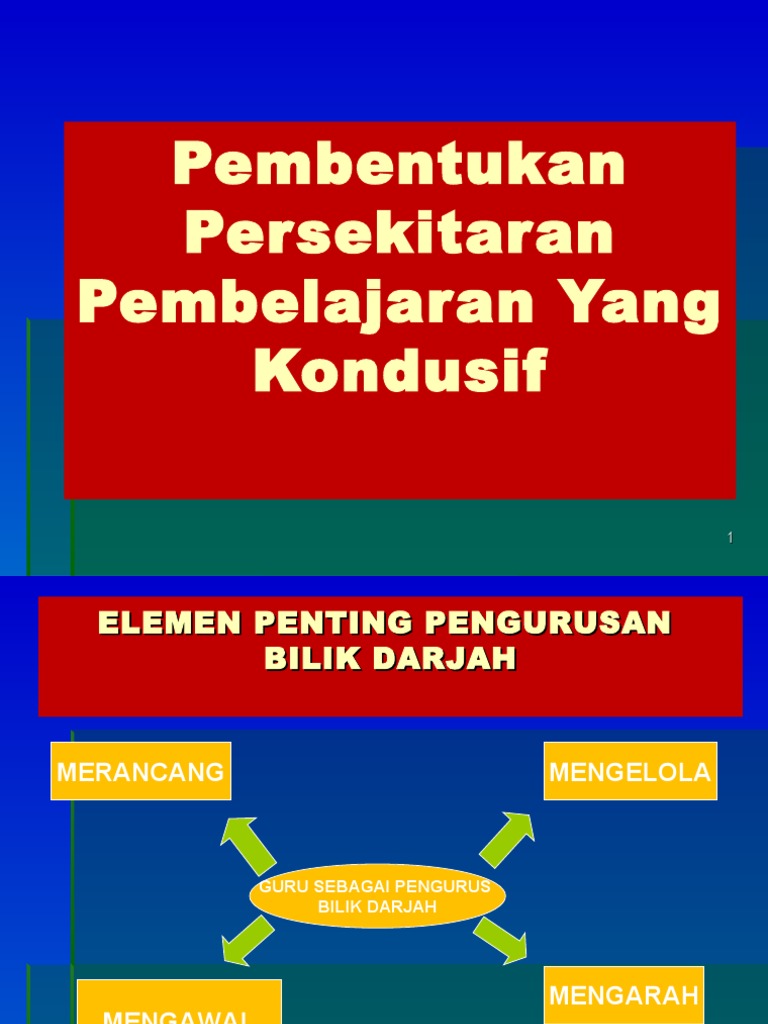 Peranan guru bukan sekadar mendidik malah perlu menyediakan persekitaran pembelajaran yang kondusif agar pelajar lebih mudah memahami apa yang. EDU3104 PENGURUSAN BILIK DARJAH TINGKAH LAKU PERSEKITARAN PEMBELAJARAN YANG KONDUSIF FATIN NURZAILA RAJAIE NORSIMA IMSORY. Pembentukan Persekitaran Pembelajaran Yang Kondusif 7.